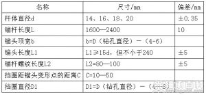 该锚杆一般采用A3圆钢加工而成。由麻花锚头、挡圈、杆体和锚尾组成,麻花锚头由圆钢的一端压扁后扭紧形成,在圆钢的另一端加工成 作为锚尾,圆钢未经任何加工的部分为杆体,挡圈采用焊接的方式与杆体连接。常用的圆钢麻花锚头锚杆的技术规格如表1-1所列。锚杆的锚头部分通过锚固剂黏结在锚杆钻孔底部,锚固力在60KN以上。